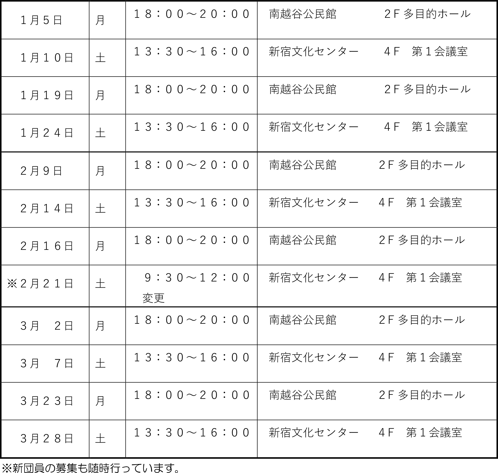 月2回・月曜 18:00~20:00 南越谷公民館(東武スカイツリーライン「新越谷駅」・JR武蔵野線「南越谷駅」より徒歩5分) |